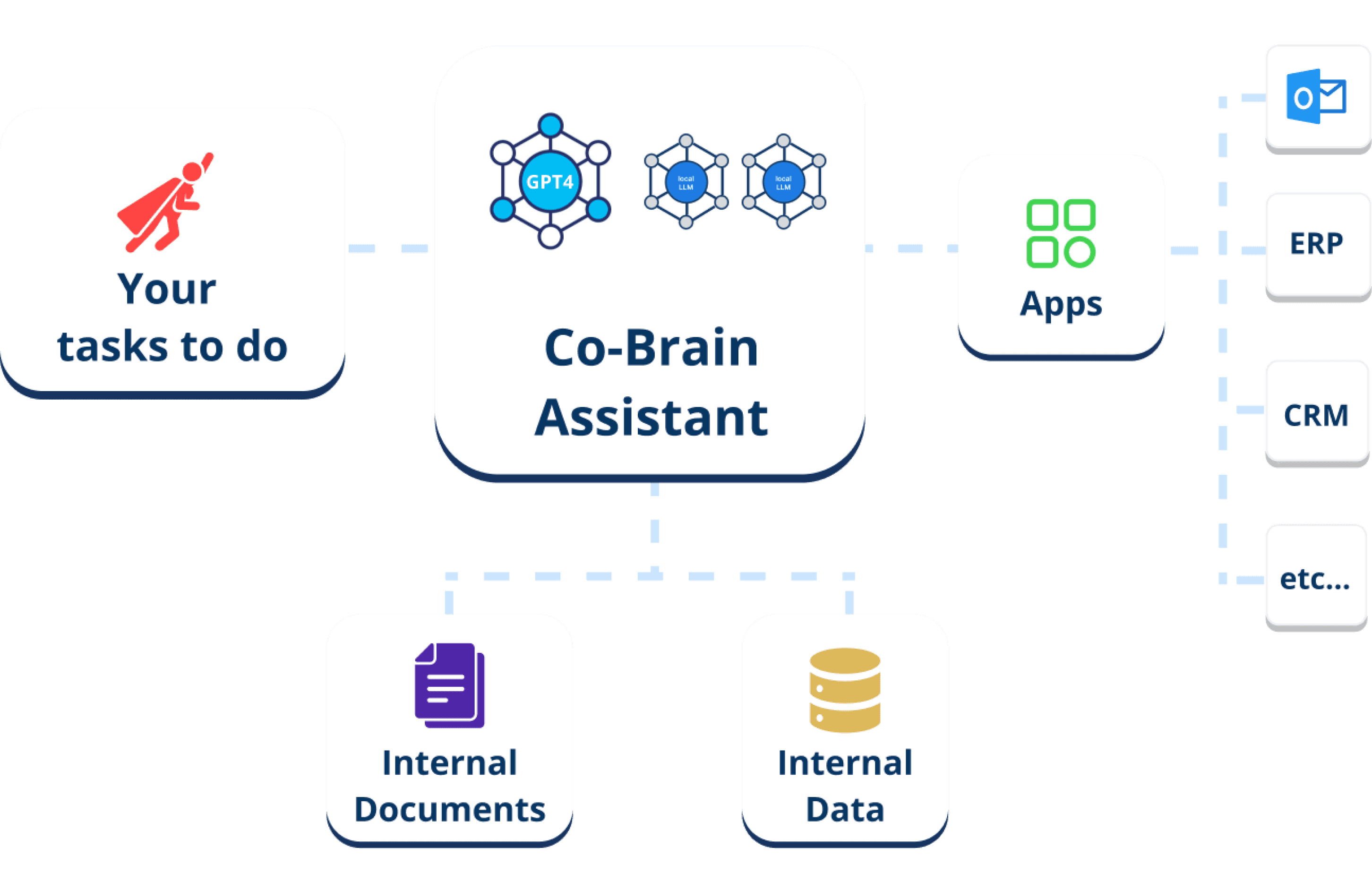 Co-Brain ermöglicht Unternehmen, KI und LLMs (wie ChatGPT4) sicher, rechtskonform und privat für interne sensible Daten einzusetzen, ohne dass sensible Daten ins Ausland transferiert werden.